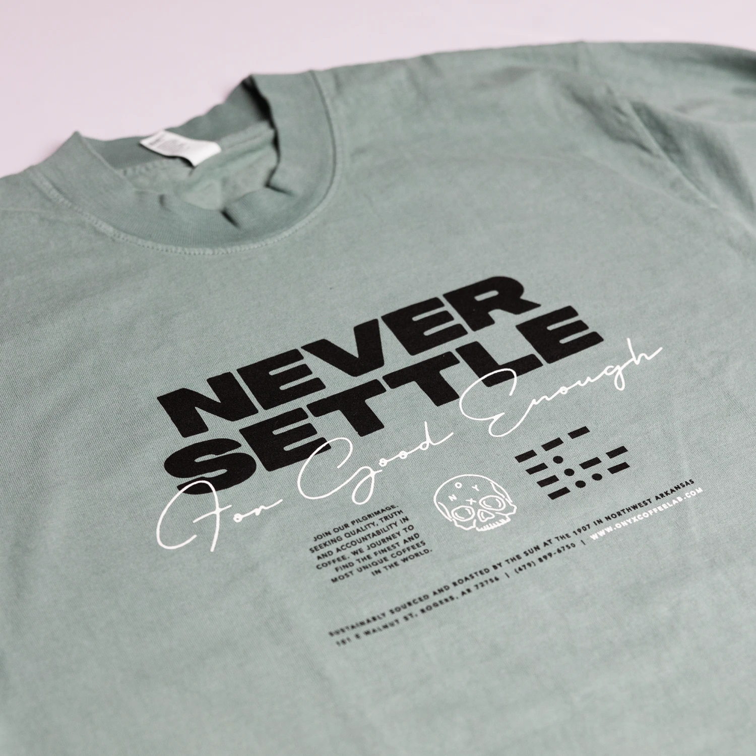 Are you feeling bold? Are you making moves? Well do we have the shirt for you! This type based design features “ONYX” in international morse code along with our call to action alongside our tried & true motto, “never settle for good enough”.