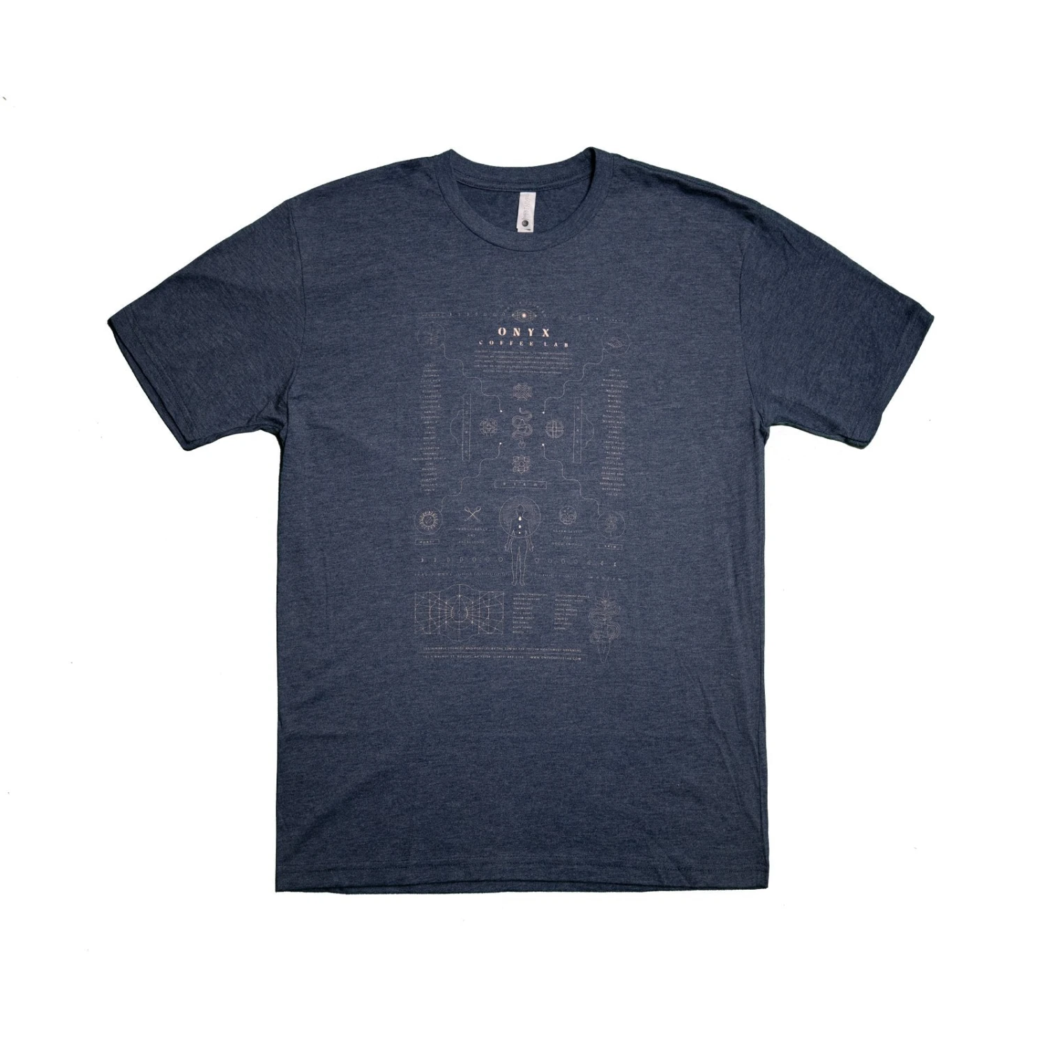 This conspectus tee shirt contrasts dark blue cotton with peach print. Oversized front print telling of our never ending journey to find the perfect coffee. Small skull and bywords printed on the upper back. This shirt is geared towards the coffee professional and works on shift or going out.
