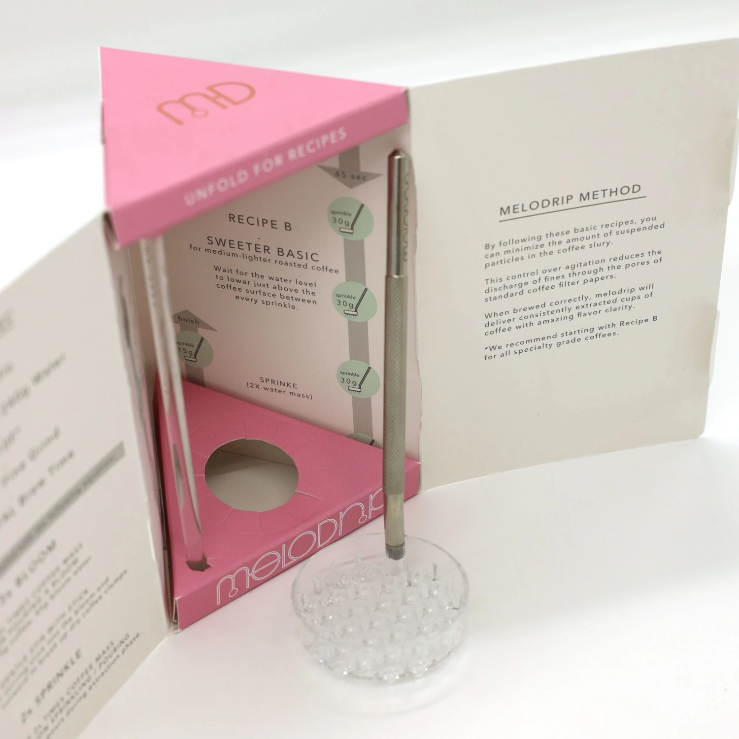 Pouring with melodrip ensures that all the water you pour is always traveling through a stable and symmetrical slurry, every time. This means your pours and recipes are reproducible and the coffee is consistently delicious. You’ll experience a silky body, heightened sweetness, and a brew with unparalleled flavor clarity.